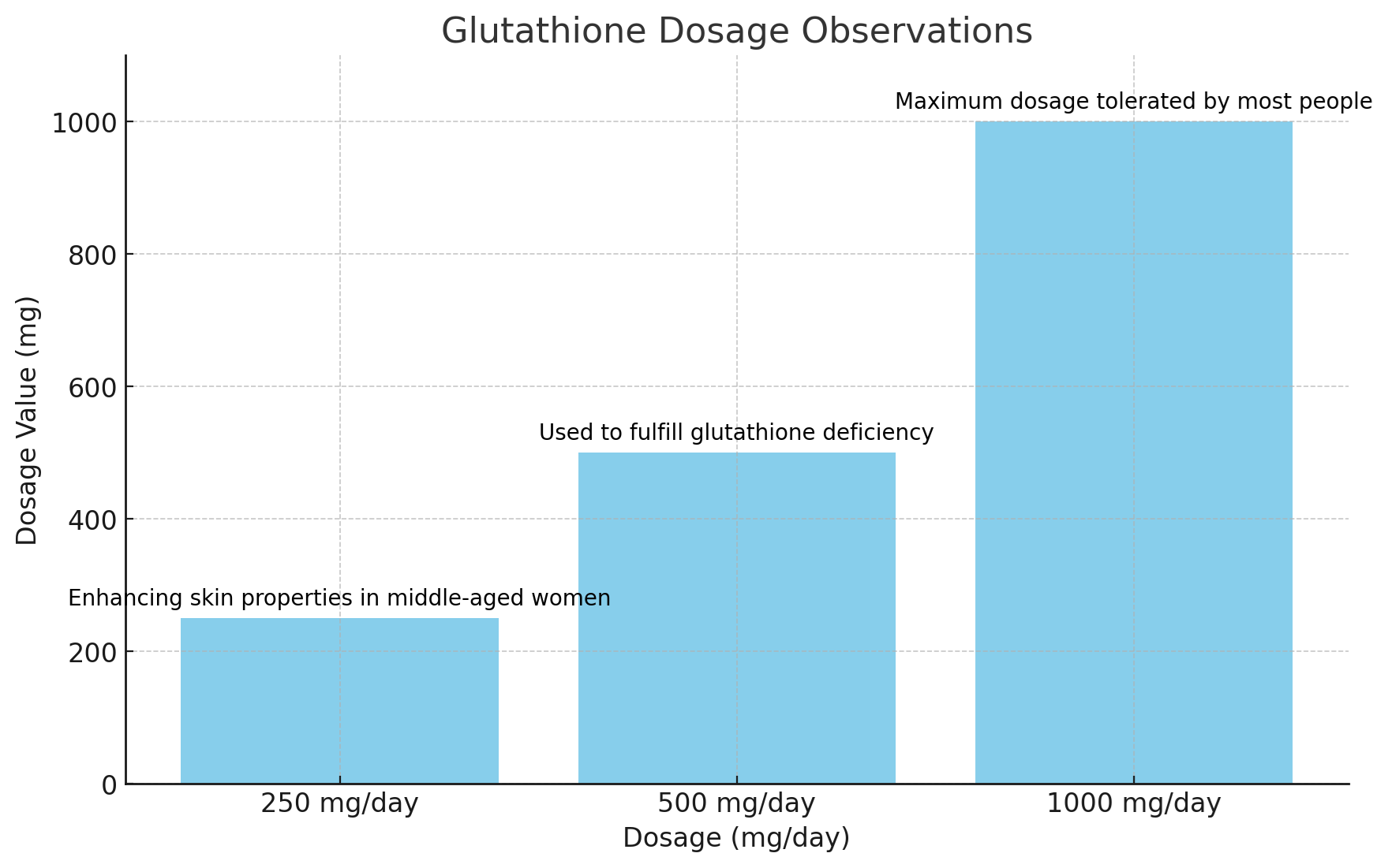 Studies show that any range between 250 to 1000 mg per day is well tolerated by most people. In case someone has a deficiency of Glutathione, he may take 500 mg of it to fulfill this deficiency. [11] However, as per research, it was observed that 250 mg of oxidized and reduced glutathione per day helps in enhancing skin properties in middle-aged women. [12]