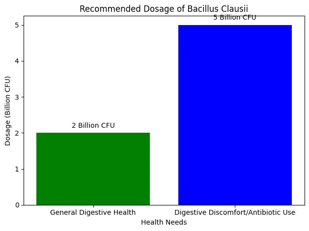 The recommended dosage of Bacillus Clausii typically ranges from 1–5 billion CFU (colony-forming units) per day, depending on your specific health needs and the formulation.