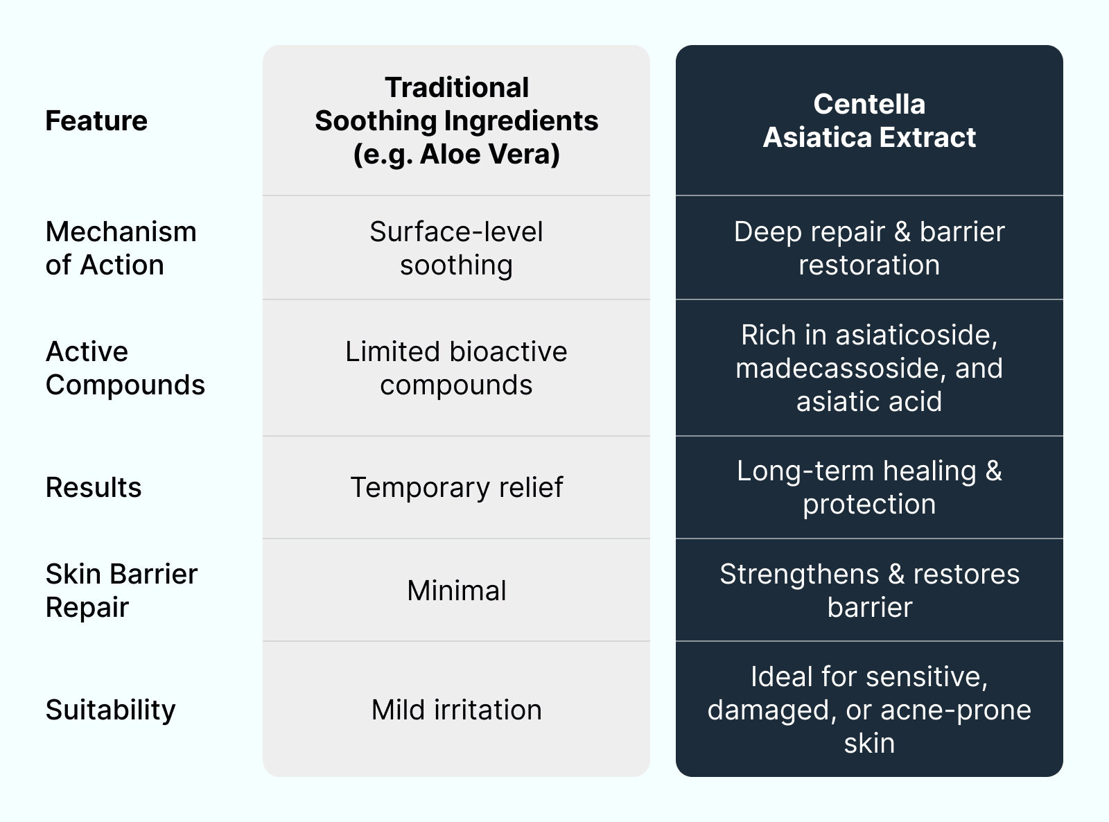 Many soothing skincare products rely on superficial ingredients like aloe vera or chamomile, which provide temporary relief but fail to address the root cause of skin issues. Others use diluted or low-quality Centella Asiatica extracts, offering minimal benefits.