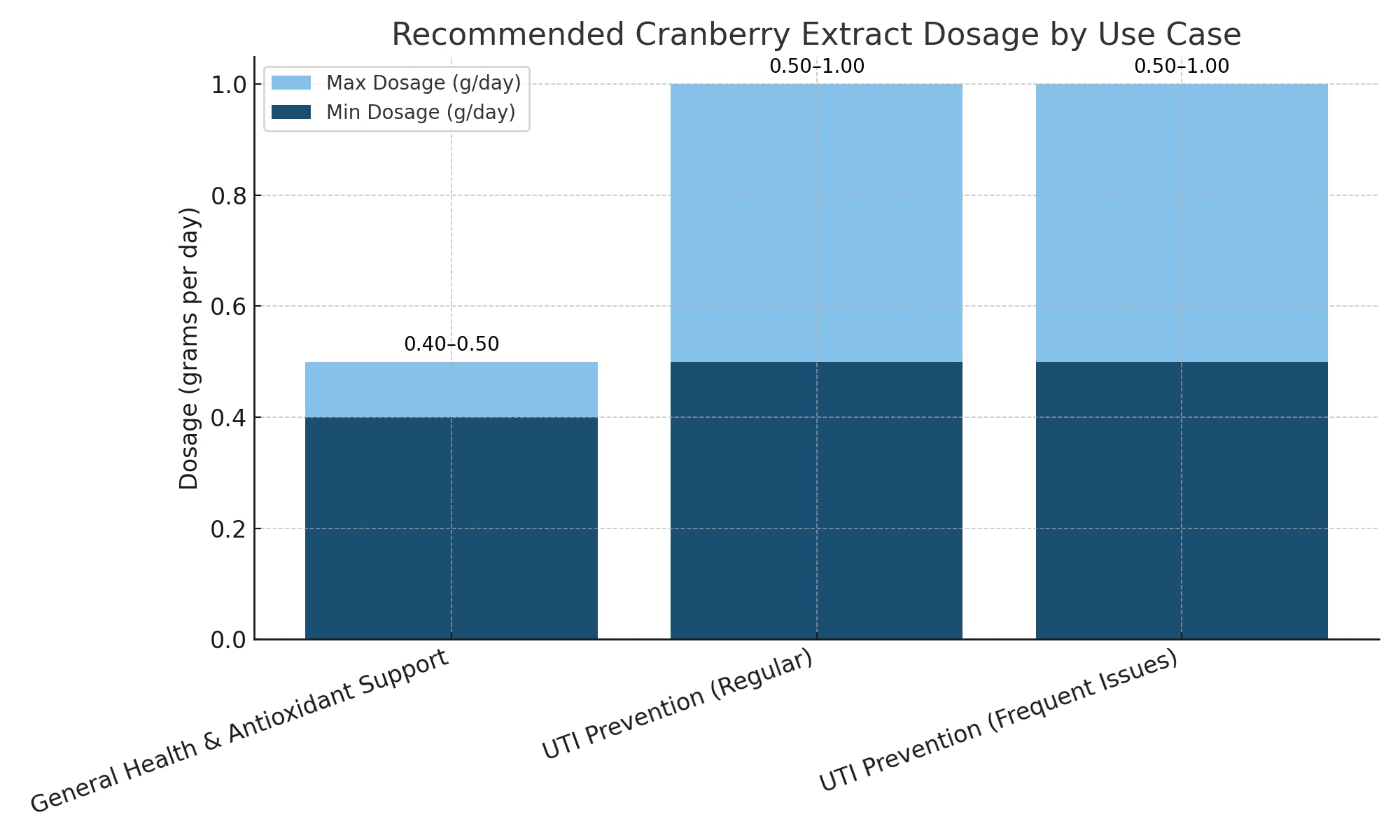 Dosage for UTI Prevention: For individuals specifically targeting UTIs, research supports a daily intake of 500-1,000 mg of cranberry extract, ideally standardized to 15-36 mg of PACs. Higher doses are more effective for individuals with frequent UTI issues, especially when taken consistently.