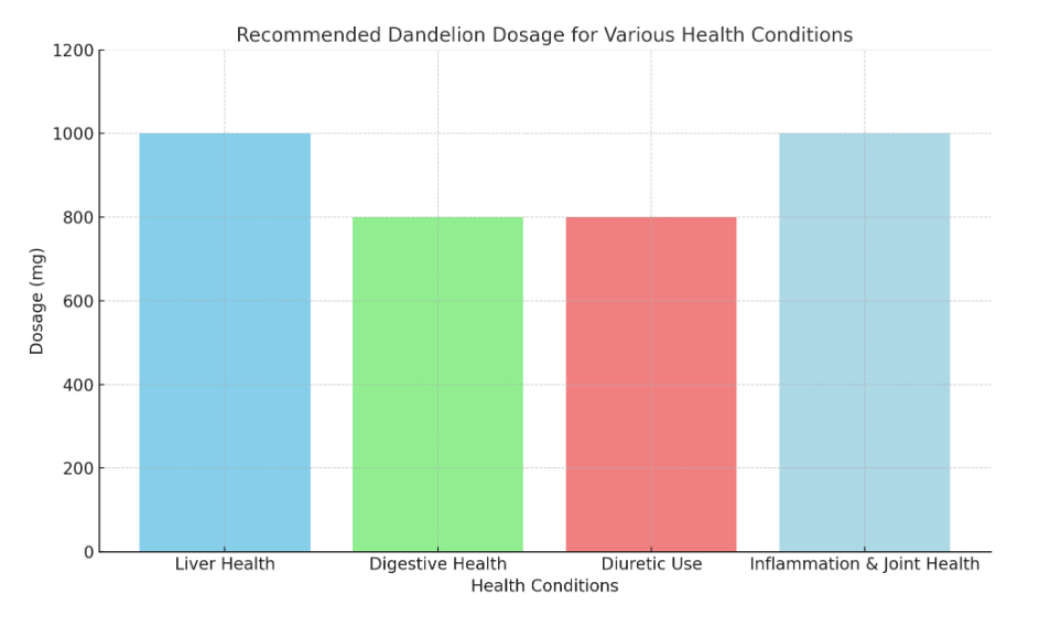 Liver Health: For liver support and detoxification, dandelion is commonly used. The typical dose 500-1,000 mg of a powdered supplement 2-3 times daily.