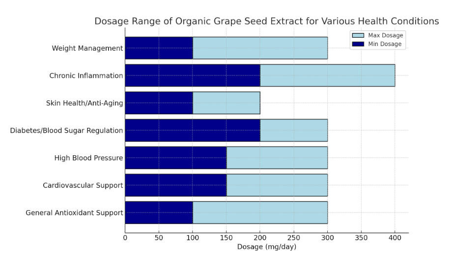 1. General Adult Dosage: For healthy adults, a typical dosage of organic grape seed extract ranges from 100 to 300 mg per day. This is considered safe for general antioxidant support, cardiovascular health, and skin protection.