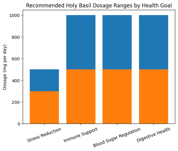 The recommended dosage of Holy Basil can vary depending on individual health goals and the form of the supplement. Below are general dosage guidelines: