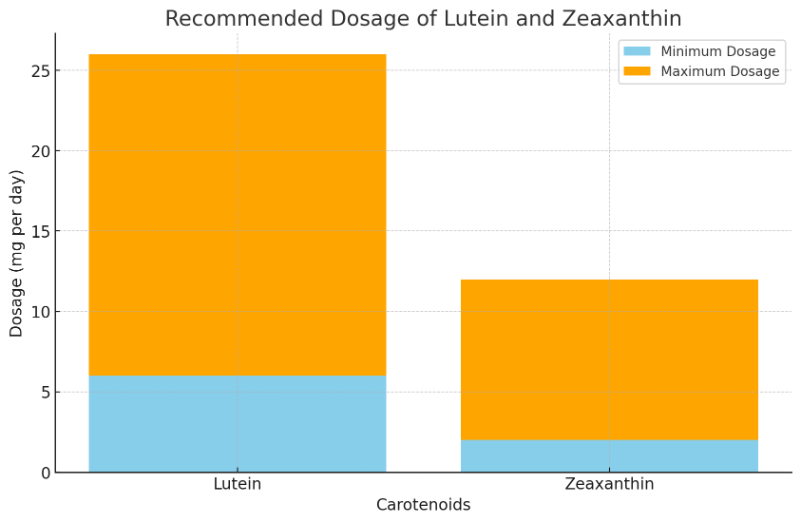The recommended dosage of Lutein and Zeaxanthin varies depending on individual health needs and dietary intake. However, general guidelines suggest: