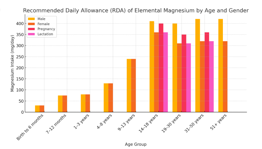 The RDA (Recommended Daily Allowance) of elemental magnesium is somewhere around 400 mg for men and 350 mg for women. However, you can manage your daily dosage as per the health requirements and the extent of deficiencies.
