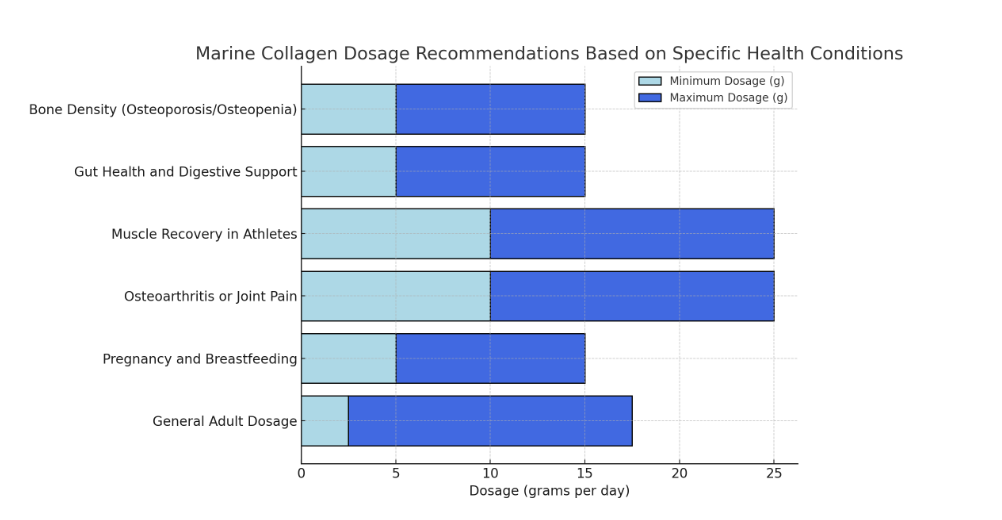 For Bone Density (Osteoporosis/Osteopenia): People with low bone density may take 5 to 10 grams daily of marine collagen to improve bone strength and reduce the risk of fractures.