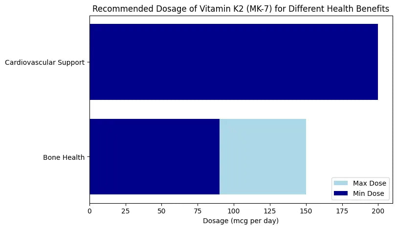 The recommended dose of Vitamin K2 (MK-7) typically ranges from 90-200 mcg per day, depending on individual health needs and specific product formulations.