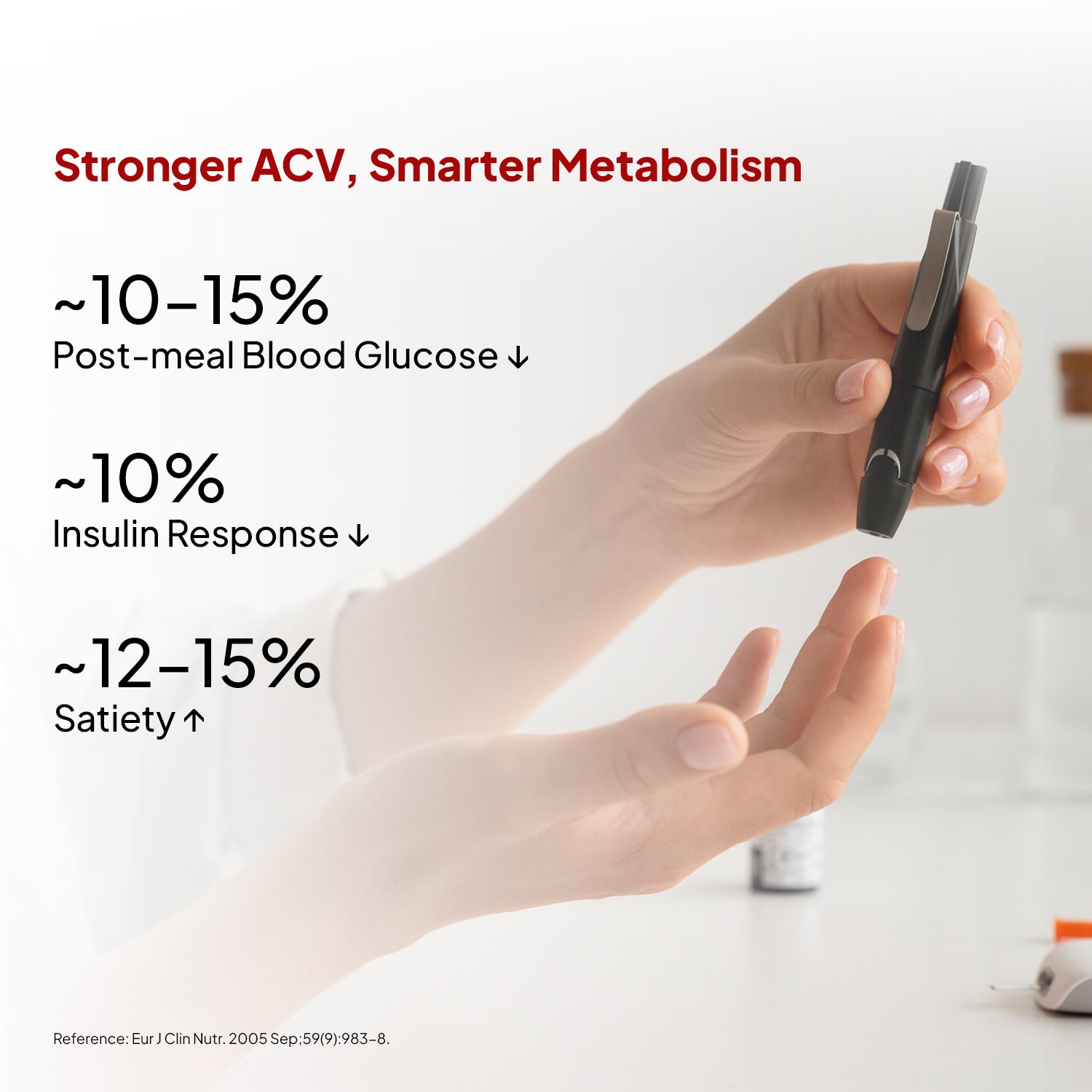 Rich in acetic acid, ACV helps improve insulin sensitivity, reduce post-meal blood sugar spikes, and support fat metabolism by activating metabolic pathways like AMPK, making it useful for weight and glucose management.