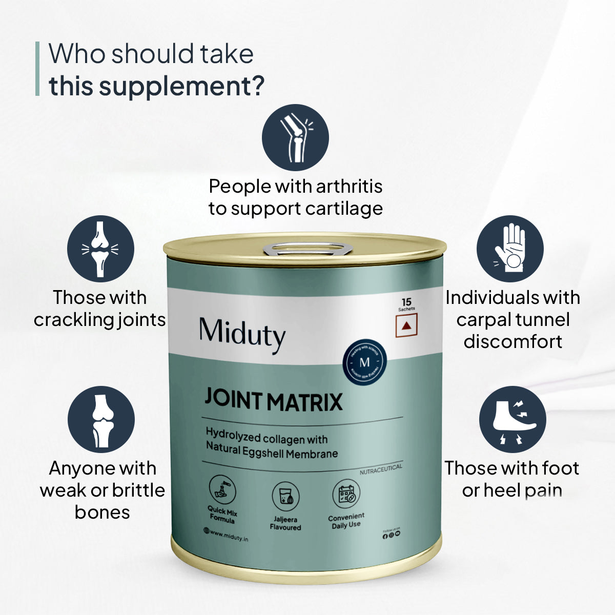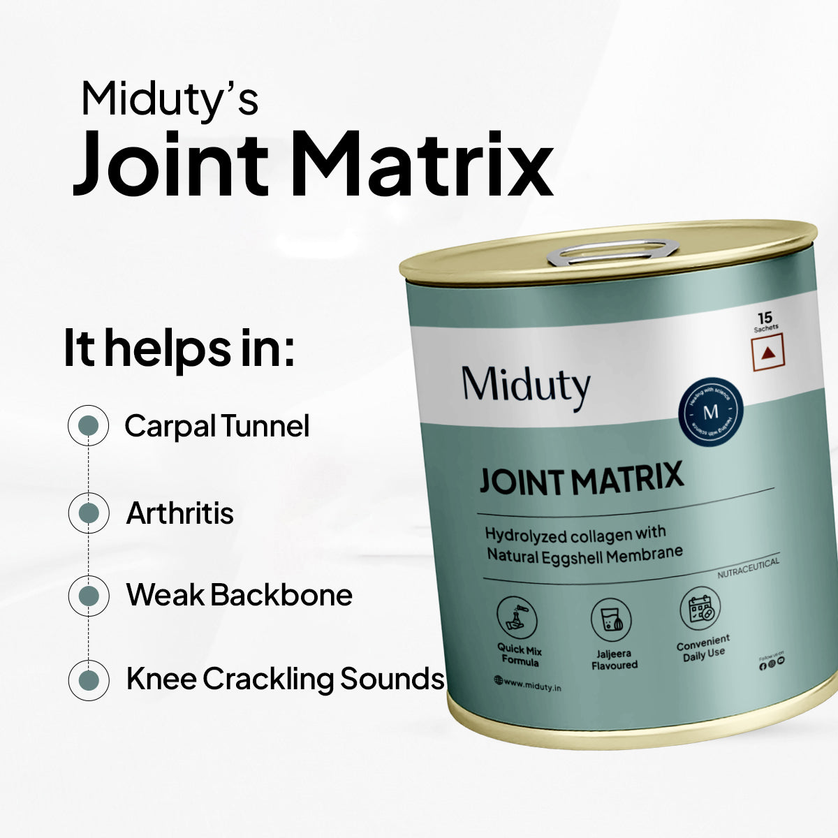 Miduty’s Joint Matrix containing hydrolyzed collagen may help provide structural support, strength, and elasticity to tissues of people suffering from osteoarthritis, rheumatoid arthritis, joint stiffness. These Joint Support supplements help to stimulate the production of cartilage and synovial fluid, which cushion and lubricate joints. It may provide essential amino acids like glycine and proline, which support tissue repair and reduce inflammation.
