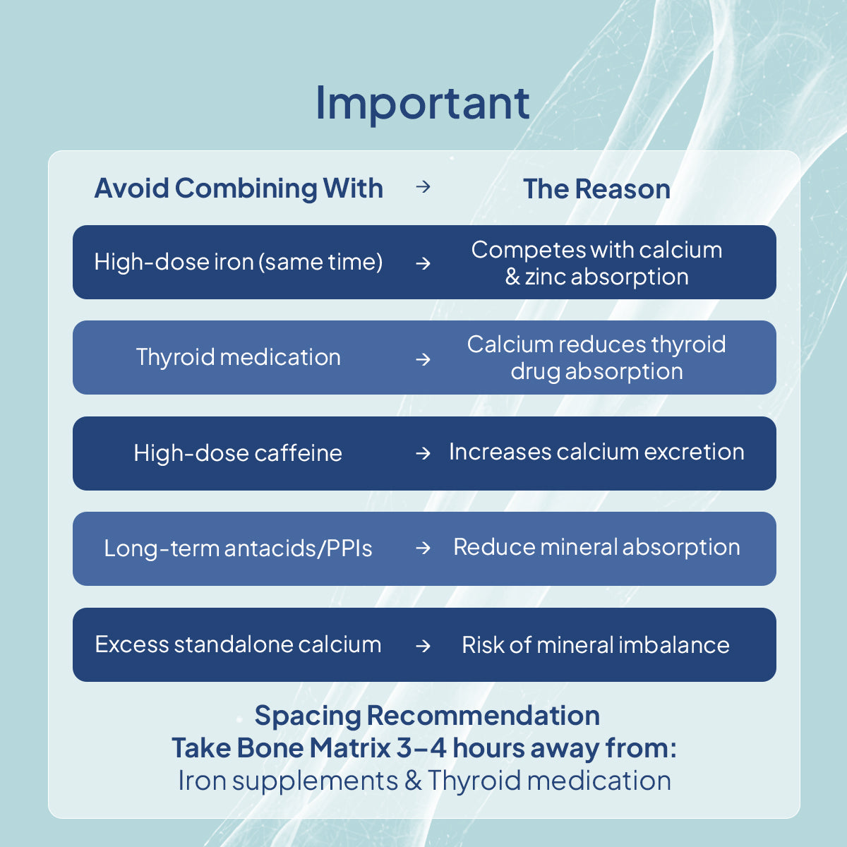Bone Matrix already contains the right amount of calcium. Adding more through separate supplements can throw off the mineral balance.