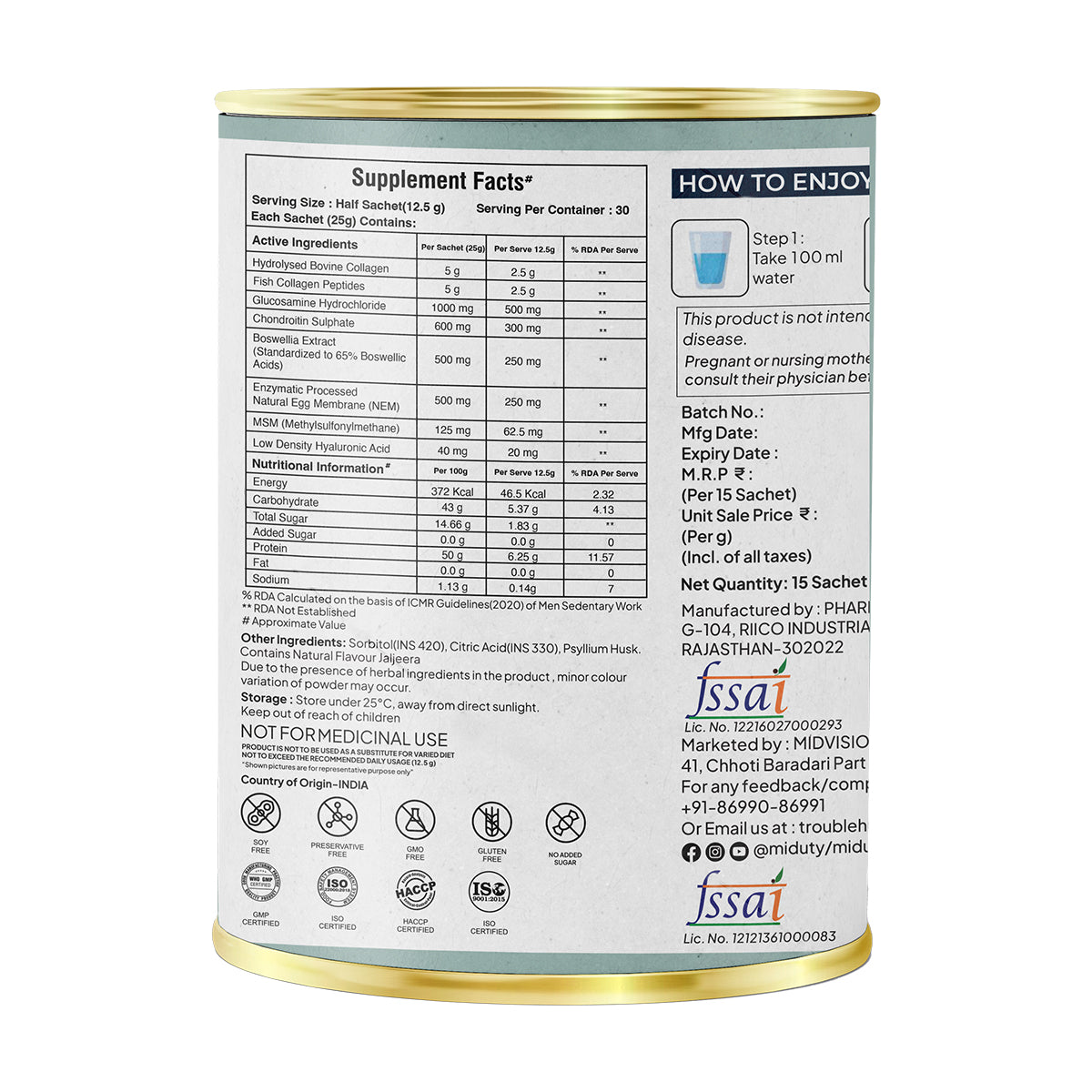 Miduty Joint Matrix is formed with the combination of powerful ingredients: Egg Shell Membrane, Hydrolyzed Collagen, Fish Collagen Peptides, Glucosamine HCL, Chondroitin Sulfate, Boswellia Serrata, and MSM (Methylsulfonylmethane), which may help in Joint pain reduction, cartilage repair, bone density improvement, inflammation reduction, and mobility. Miduty’s Joint Matrix has the hero ingredient Natural EggShell Membrane that may help repair joint and connective tissue disorders.