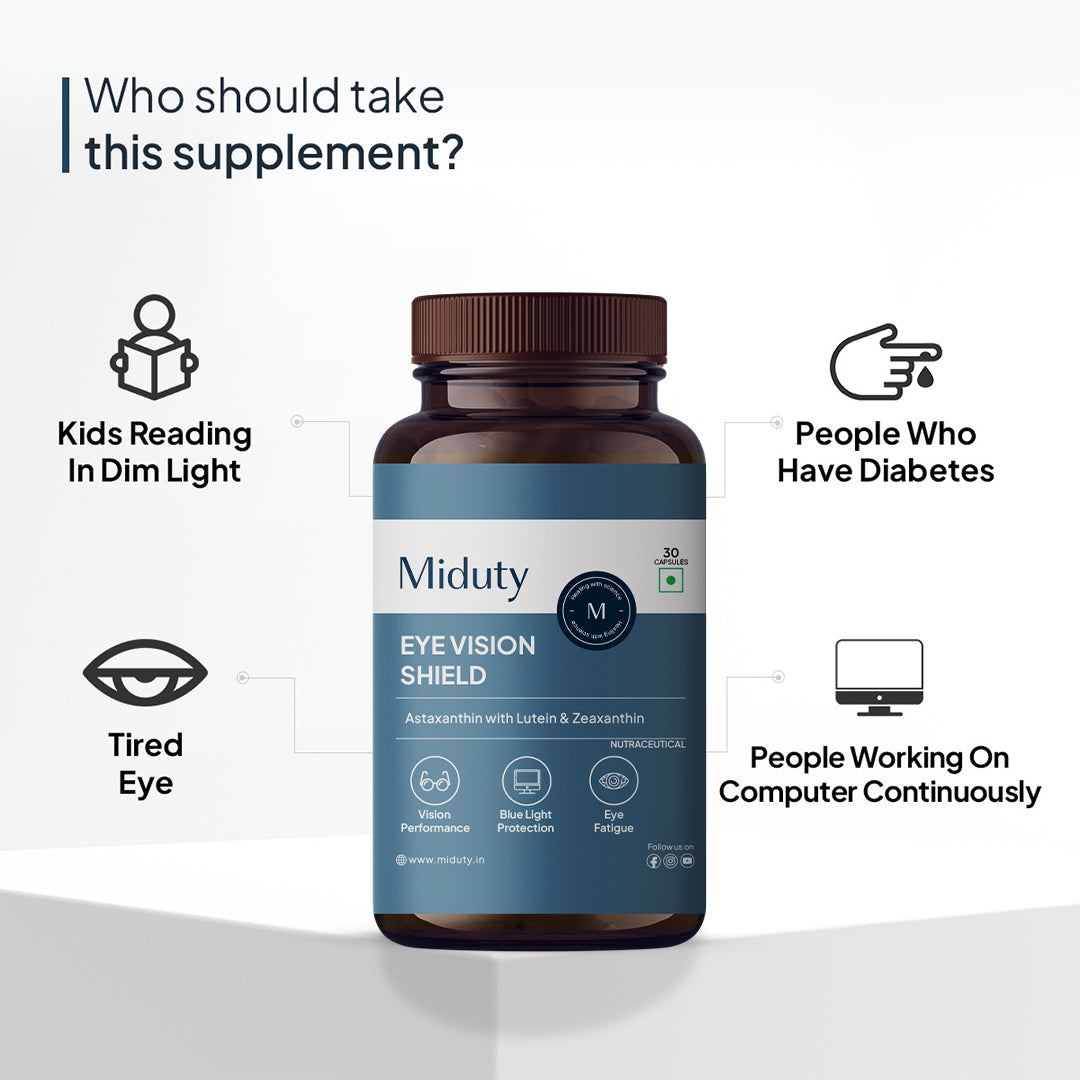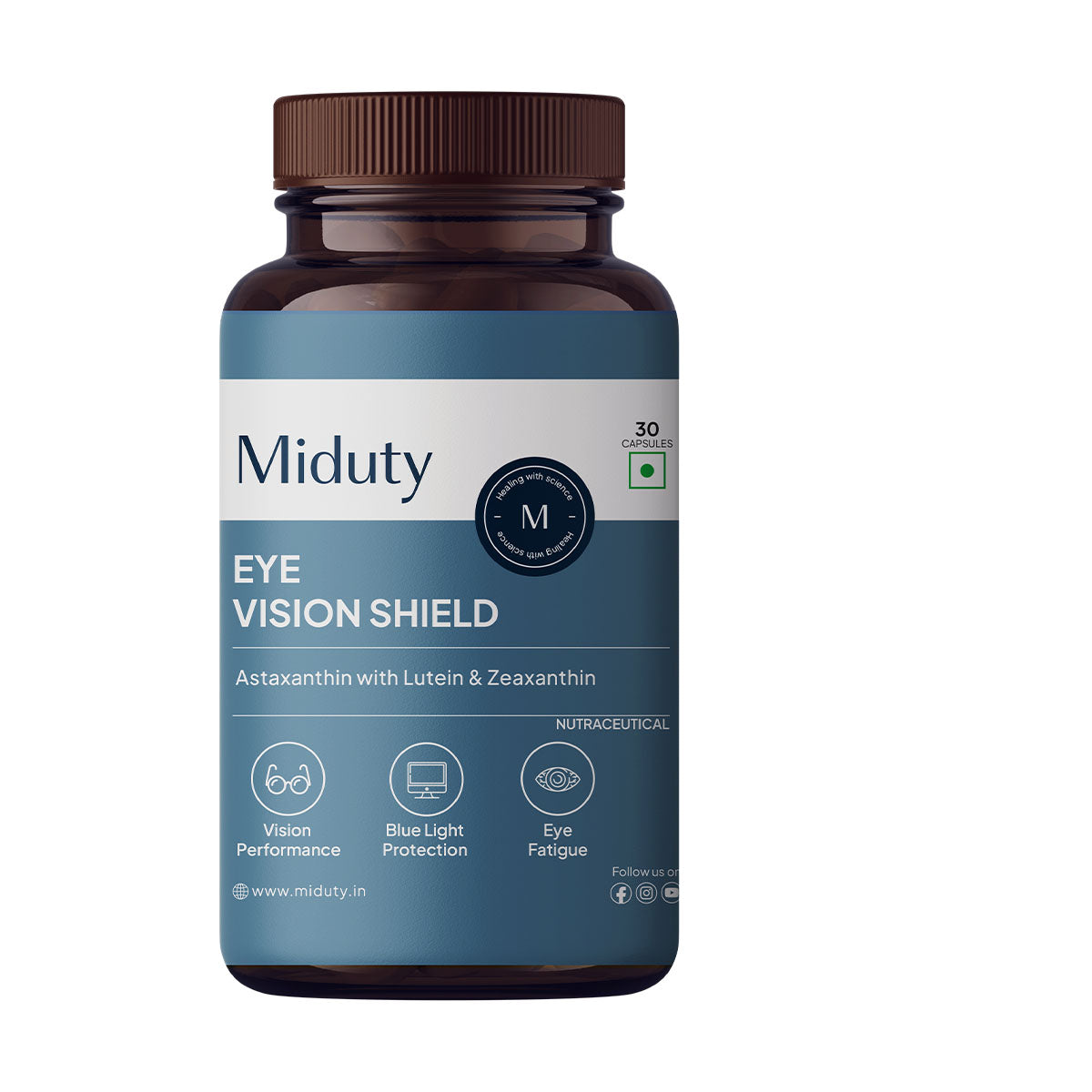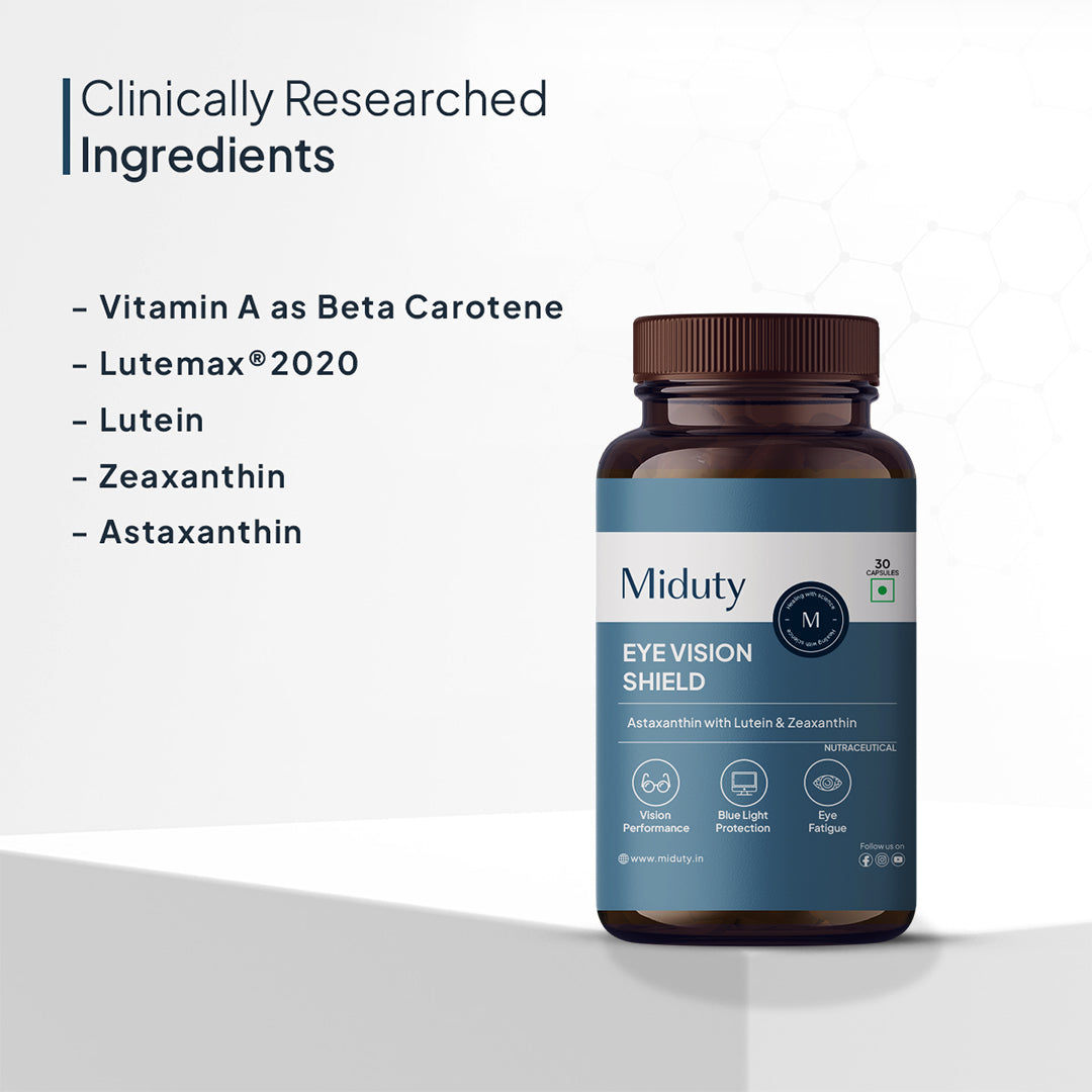 Miduty Eye Vision Shield is enriched with Patented Lutemax 2020 (Lutein & Zeaxanthin), Astaxanthin, Zinc, and Vitamin A to combat screen-induced eye stress and enhance vision clarity.