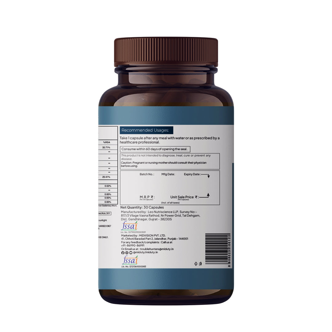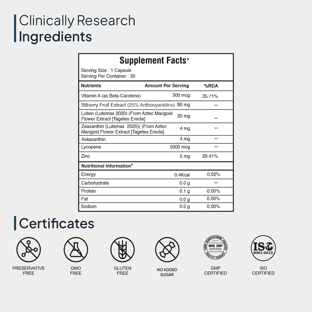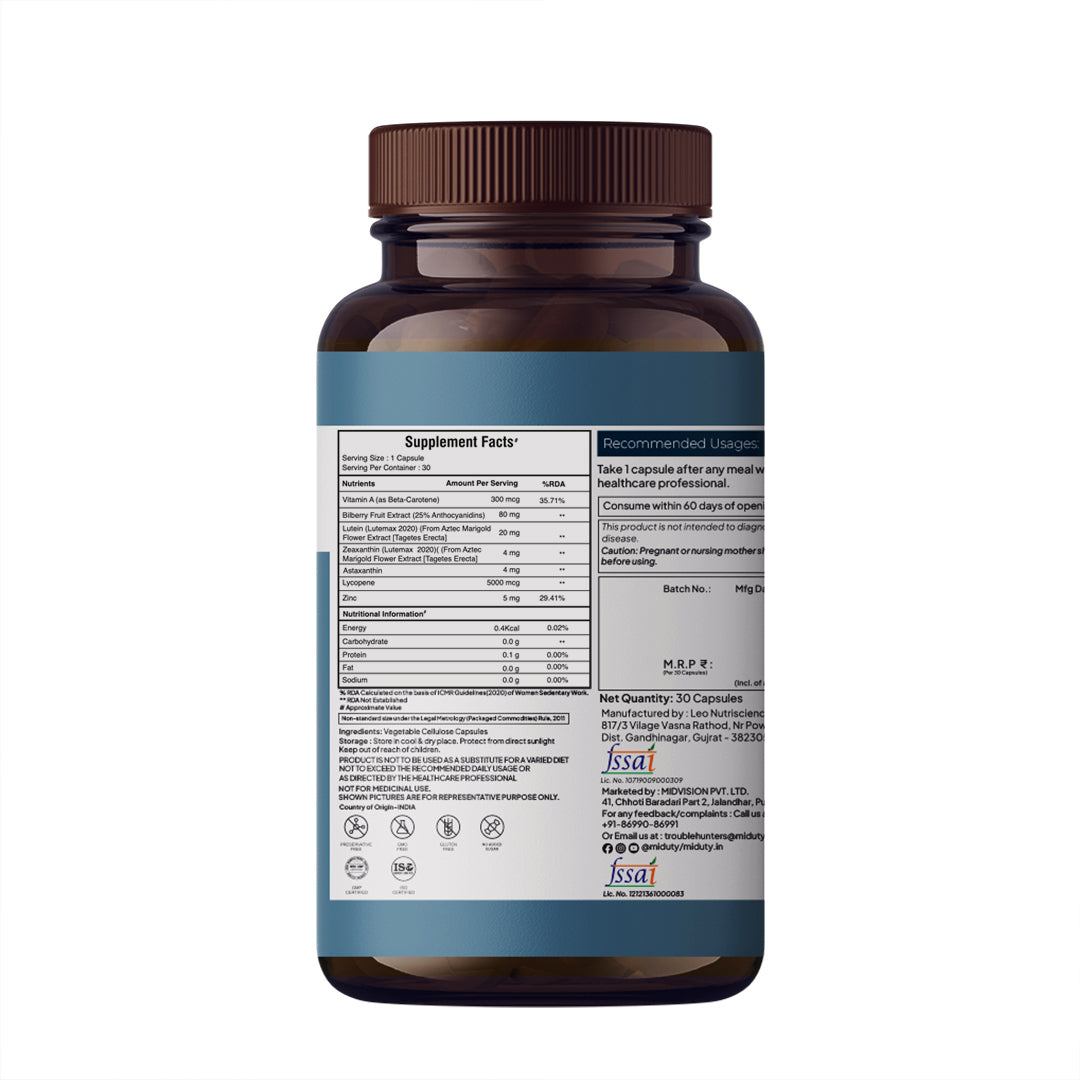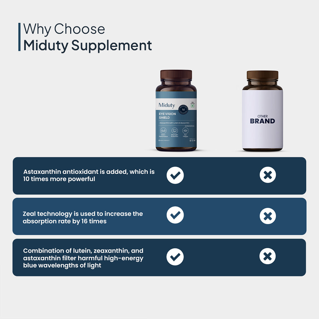 Miduty Eye Vision Shield is enriched with Patented Lutemax 2020 (Lutein & Zeaxanthin), Astaxanthin, Zinc, and Vitamin A to combat screen-induced eye stress and enhance vision clarity.