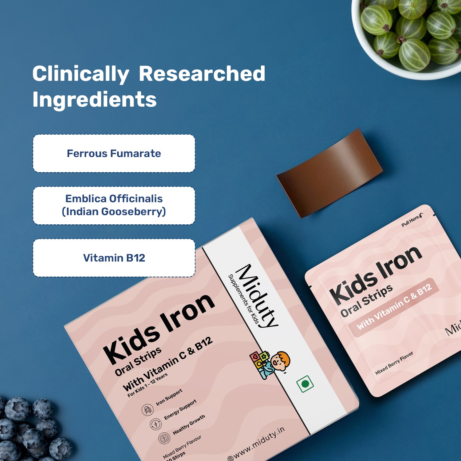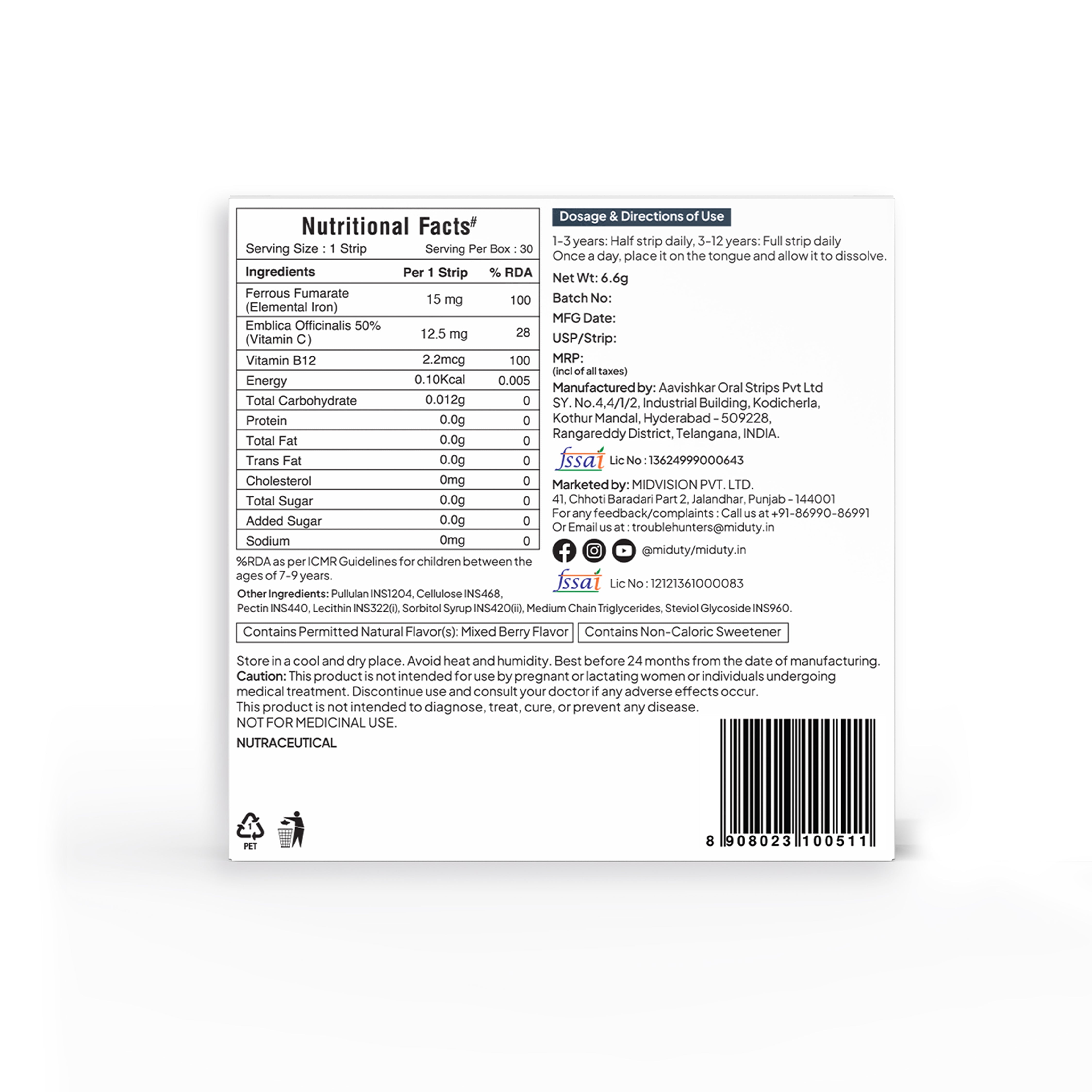Introducing Miduty Kids Iron Strips the ultimate, hassle-free way to boost your child's health with the best iron for kids. Our specially designed formula combines three powerhouse ingredients to support your child's well-being and vitality: Indian gooseberry (amla), iron, and Vitamin B12.