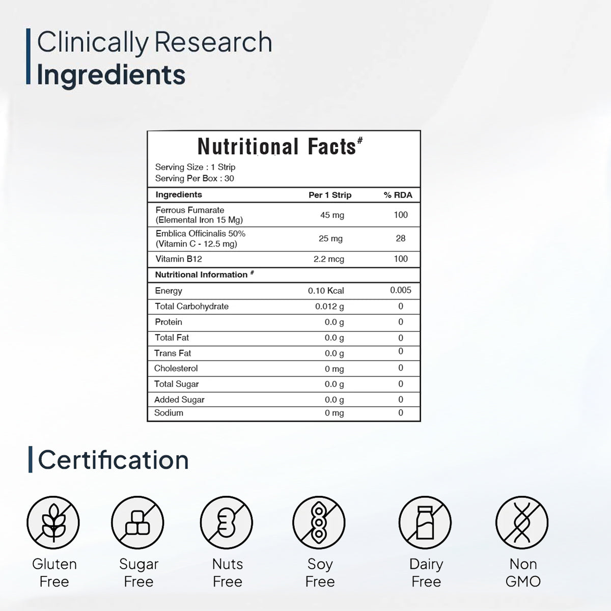 Our iron supplements for kids are crafted as convenient oral strips. No more dealing with pills or liquids, these strips dissolve right on the tongue, making them perfect for picky eaters and hassle-free for busy parents.
