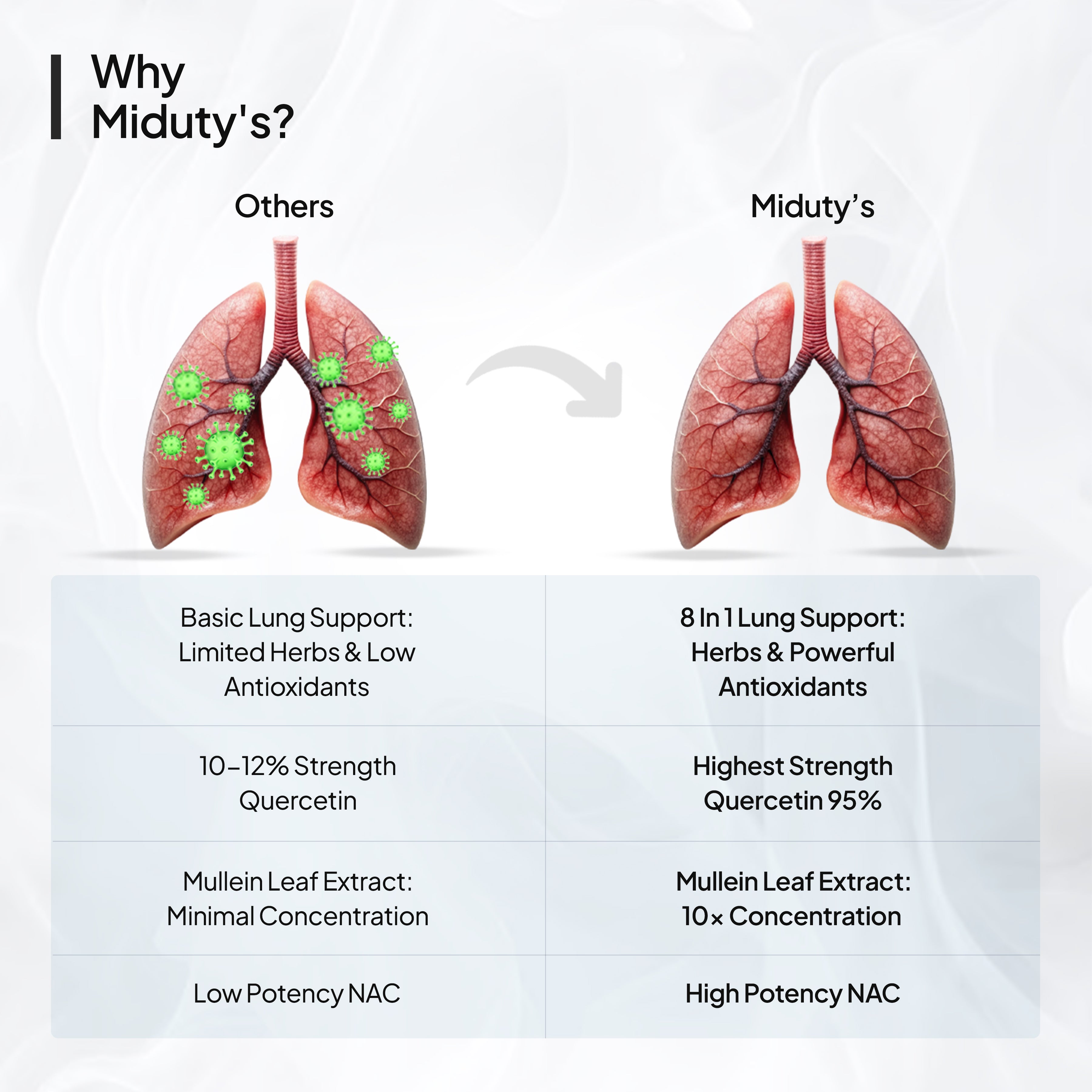 Protect your respiratory health with Miduty Lung Detox, a powerful 8-in-1 formula designed to cleanse, support, and rejuvenate your lungs. Whether you're a smoker, living in a polluted environment, exposed to allergens, or simply looking to improve your breathing capacity, this scientifically formulated lung detox supplement is the ultimate solution.
