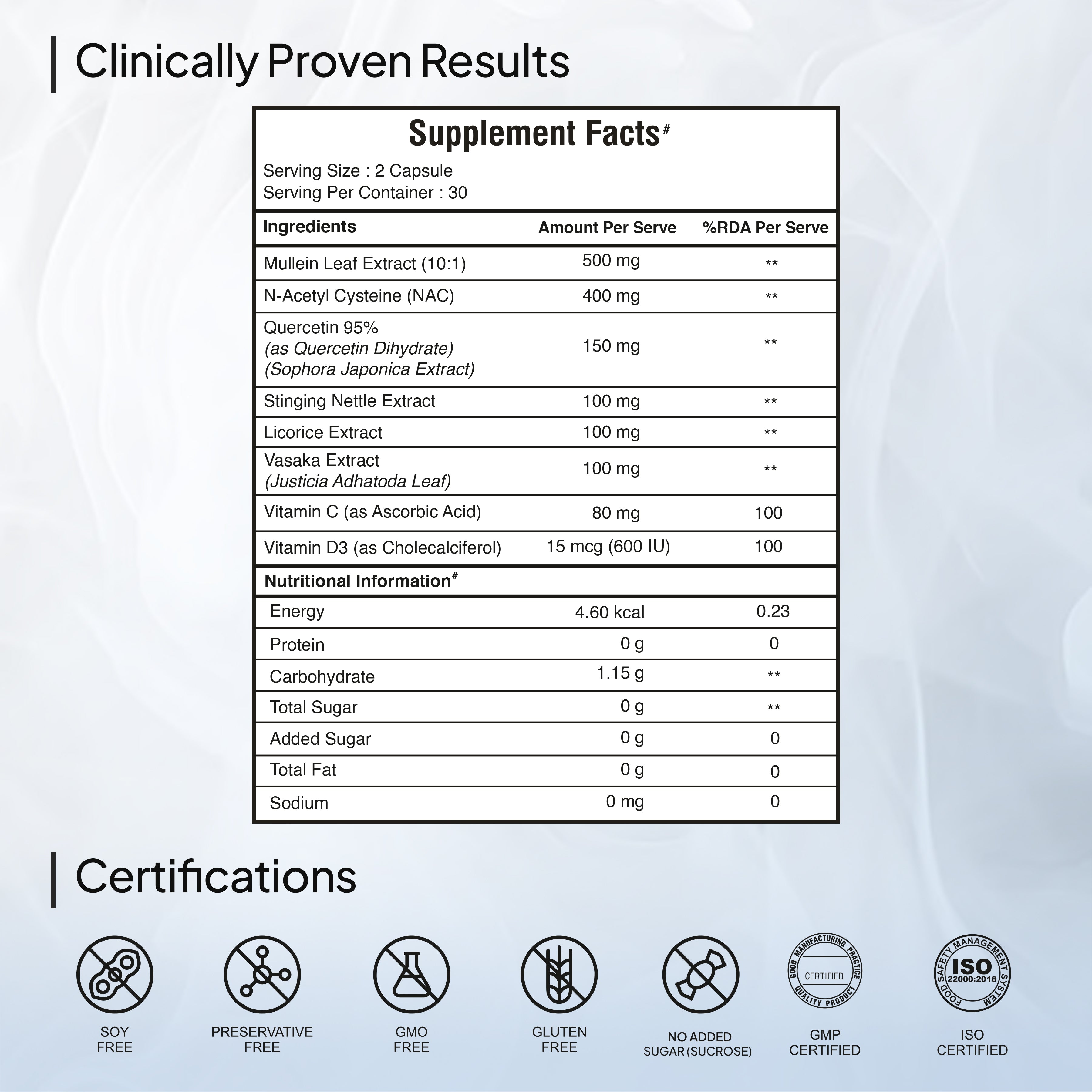 Formulated with NAC, Quercetin, Stinging Nettle, Licorice Extract, Mullein Leaf Extract, Vitamin D3, Vasaka, and Vitamin C, this advanced blend helps remove toxins, reduces inflammation, enhances oxygenation, promotes lung function, protects Smokers from COPD & Lung Damage, Eliminates Tar & Toxins from Smokers’ Lungs, Relieves Chest Congestion & Improves Breathing.