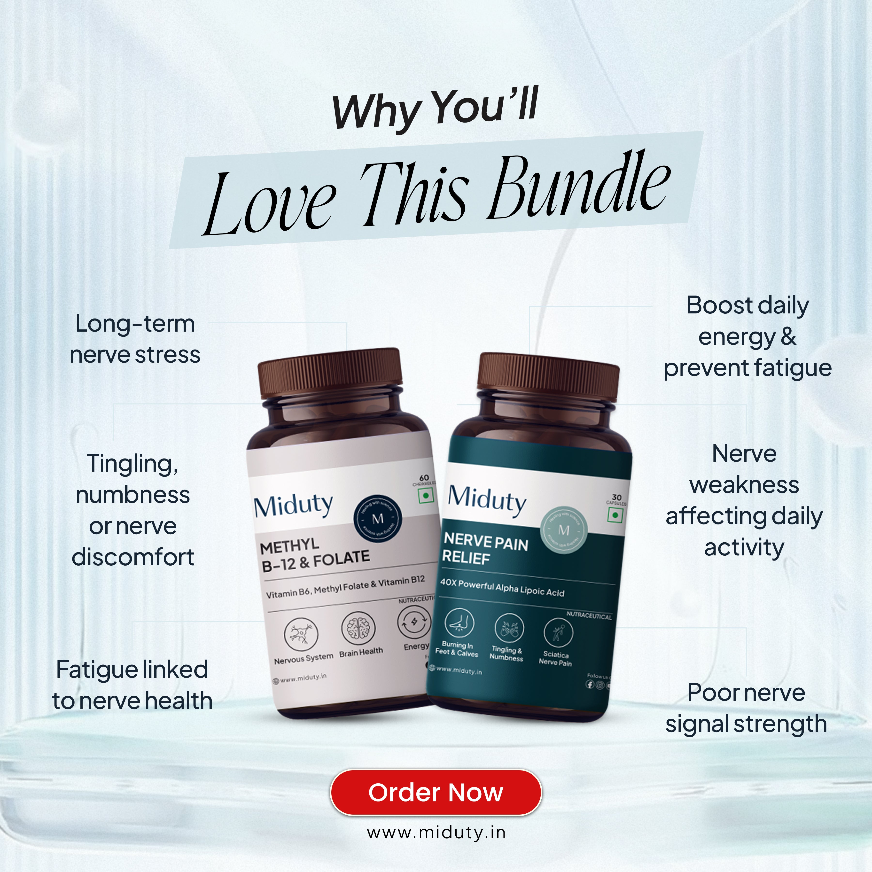 The Miduty Nerve Pain Support Bundle is specifically formulated to target the root causes of nerve pain, providing powerful relief and promoting nerve health. Nerve Pain Relief contains potent ingredients like Horse Chestnut, D-Biotin, and R-Lipoic Acid. These ingredients work together to reduce inflammation, support nerve repair, and minimize nerve damage, helping you regain comfort and mobility.