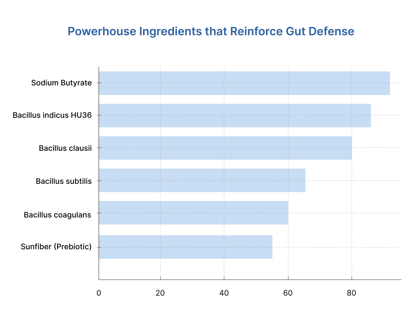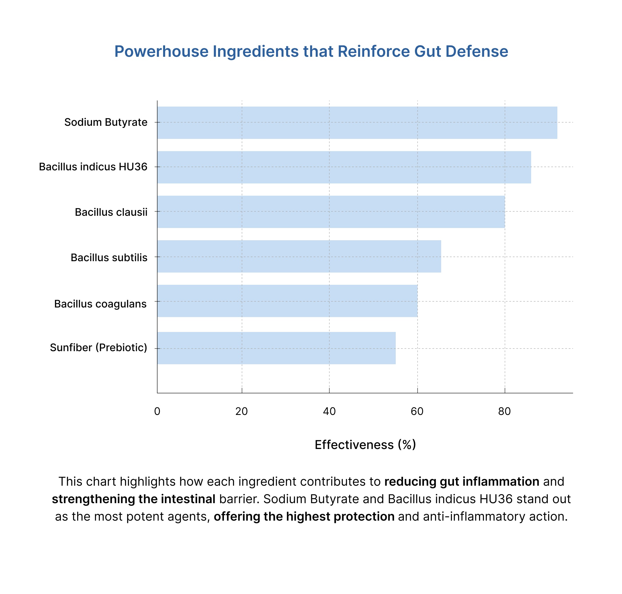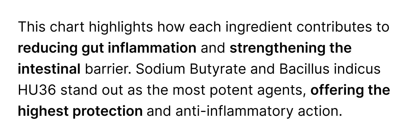 Sunfiber (Partially Hydrolyzed Guar Gum) acts as a soluble prebiotic fiber, feeding the probiotics and aiding regular bowel movements. Studies indicate it can increase beneficial bacteria like Bifidobacteria by 28% within weeks. Postbiotics, such as Sodium Butyrate, play a crucial role in reinforcing the intestinal barrier, reducing inflammation, and supporting brain health