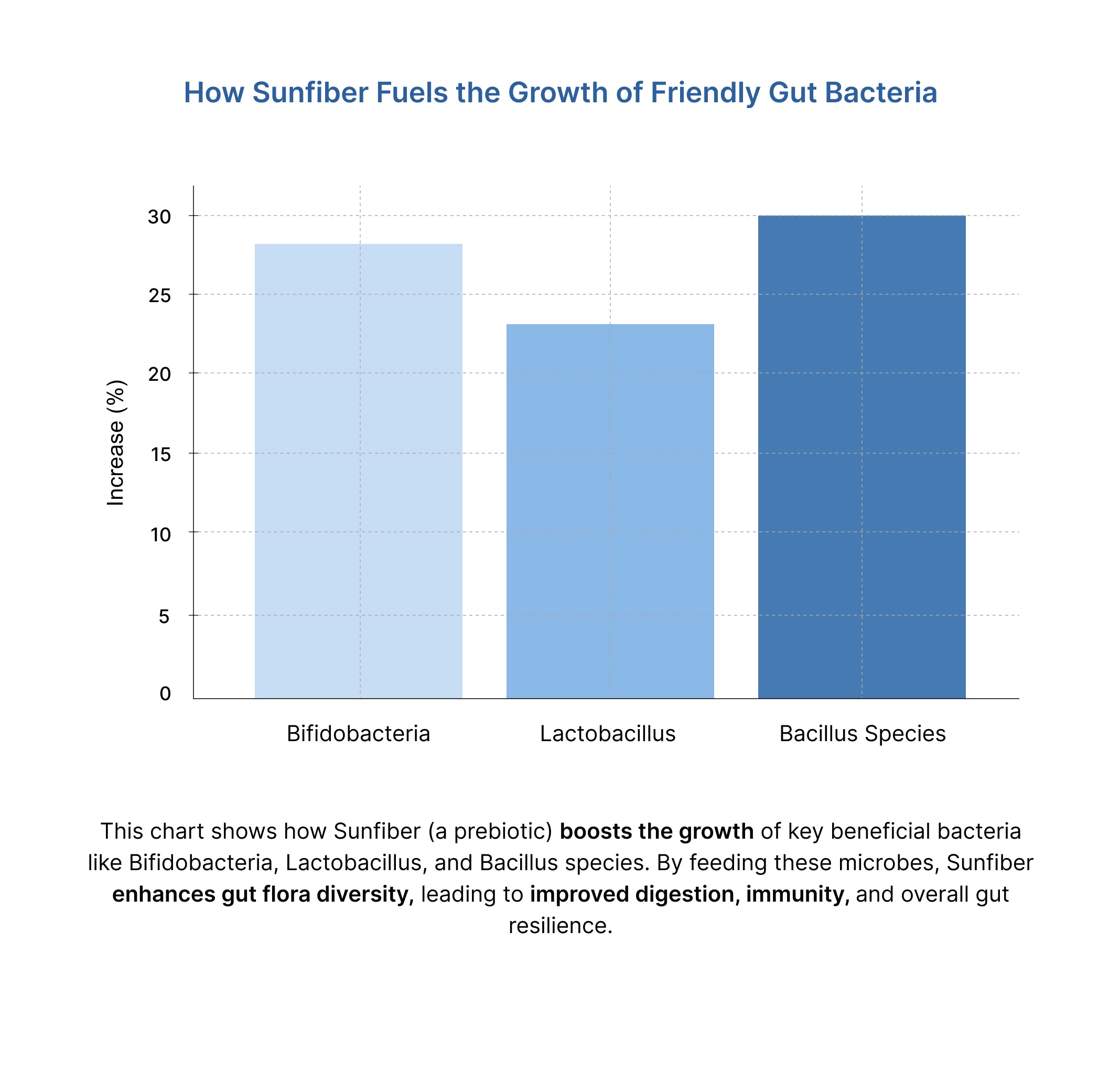 In adult and pediatric trials, PHGG improved stool frequency and consistency and reduced GI discomfort and bloating. [5] By feeding beneficial gut bacteria (and our probiotic strains) with fermentable fiber, Sunfiber enhances the growth of commensals and the production of short-chain fatty acids (SCFAs).