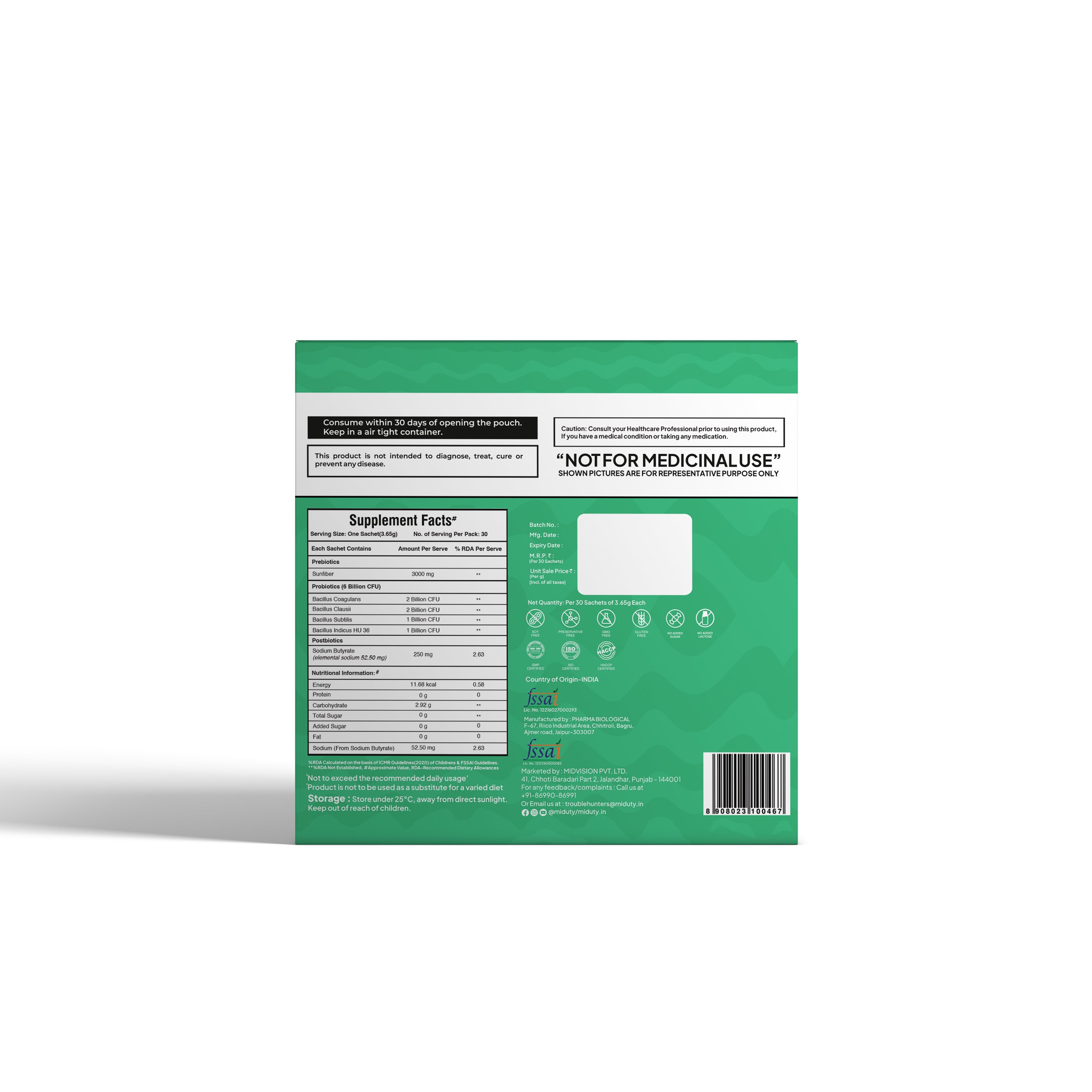 Each scoop of Miduty PROBIOTICS+ delivers 6 billion CFU of active probiotic cultures, fortified with 3,000 mg of Sunfiber and 250 mg of Sodium Butyrate.