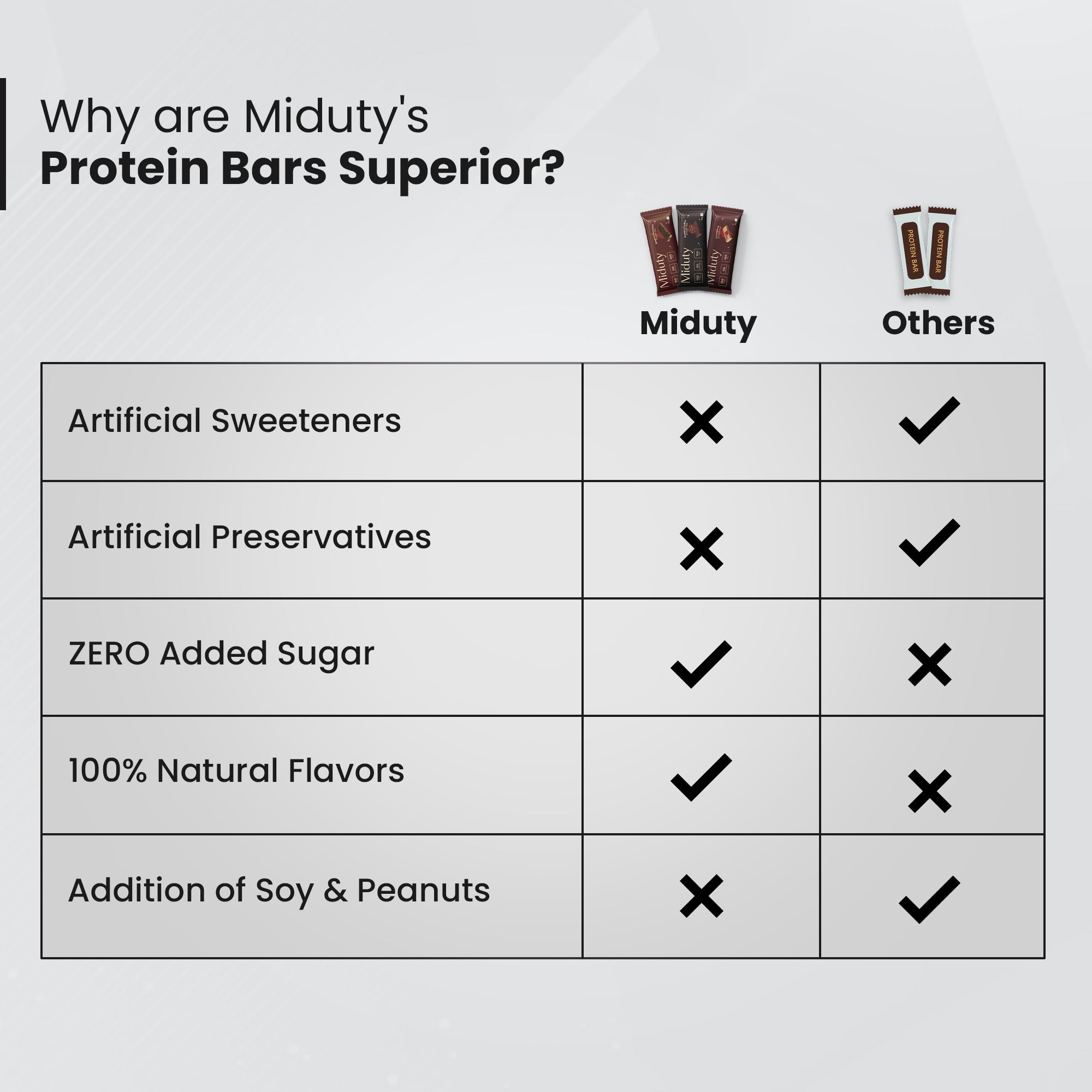 Many Protein bars contain soy or peanuts, which can be problematic for people with allergies or autoimmune conditions. Miduty Protein Bars are soy and peanuts-free, ensuring they are safe for those with autoimmune conditions or specific dietary specifications.