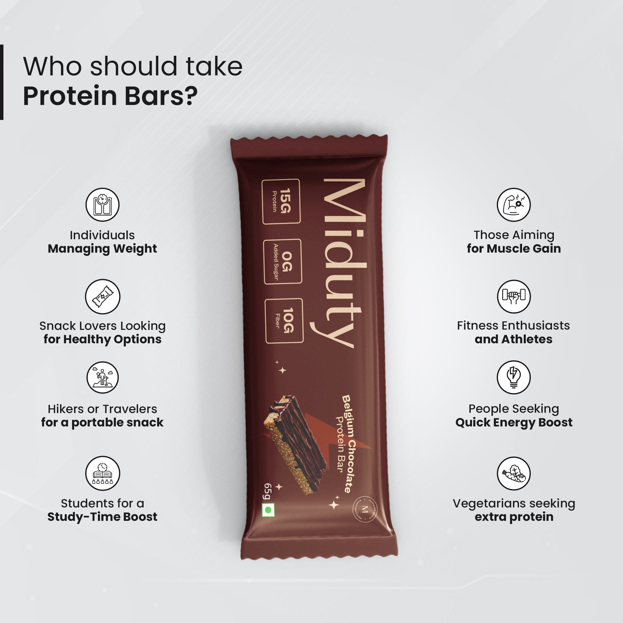 A truly balanced diet is about more than just avoiding unhealthy foods, it's about making consistent, nutritious choices that fuel and nourish your body throughout the day. That’s where Miduty Protein bars come in. Each Miduty Protein Bar contains 15g of Whey Isolate Protein, one of the most bioavailable and easily digestible protein sources.