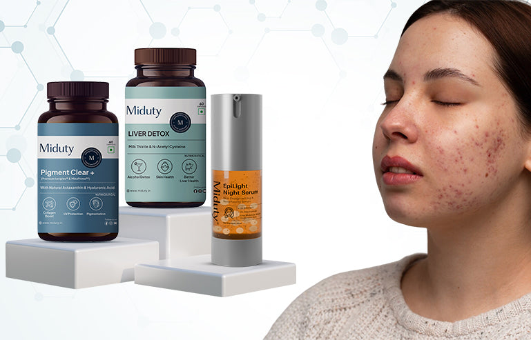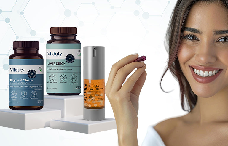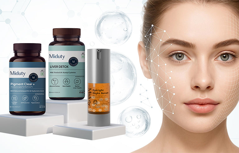 Your skin gets brighter when your liver gets lighter. Miduty’s Skin Glow Bundle is a structured 3-in-1 solution that pairs detox with pigment correction and Epi Light Night serum to support externally. We’ve built it on practical science, and you’ll see real-world results when you follow it right.
