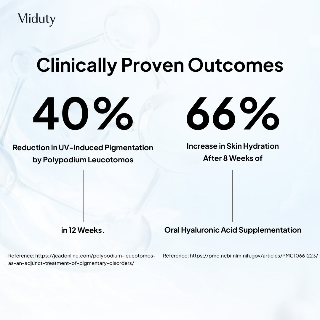 To complement the internal support, this bundle is paired with Miduty EpiLight Night Serum, an anti-pigmentation topical serum. This advanced formula is enriched with RAYOLYS™ (a botanical blend clinically shown to reduce melanin and pigmentation), Niacinamide for skin brightening, and hyaluronic acid-infused beads that offer deep cellular hydration.