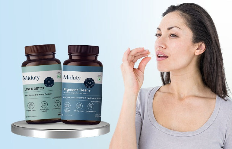 The Miduty Skin Glow Bundle isn’t just two supplements—it’s a step-by-step protocol that corrects pigmentation from its root. By combining Miduty Liver Detox and Miduty Pigment Clear+, this bundle tackles oxidative stress, hormonal pigmentation, sluggish liver function, and poor skin barrier repair—all while aligning with real lifestyle changes for clear, glowing skin.