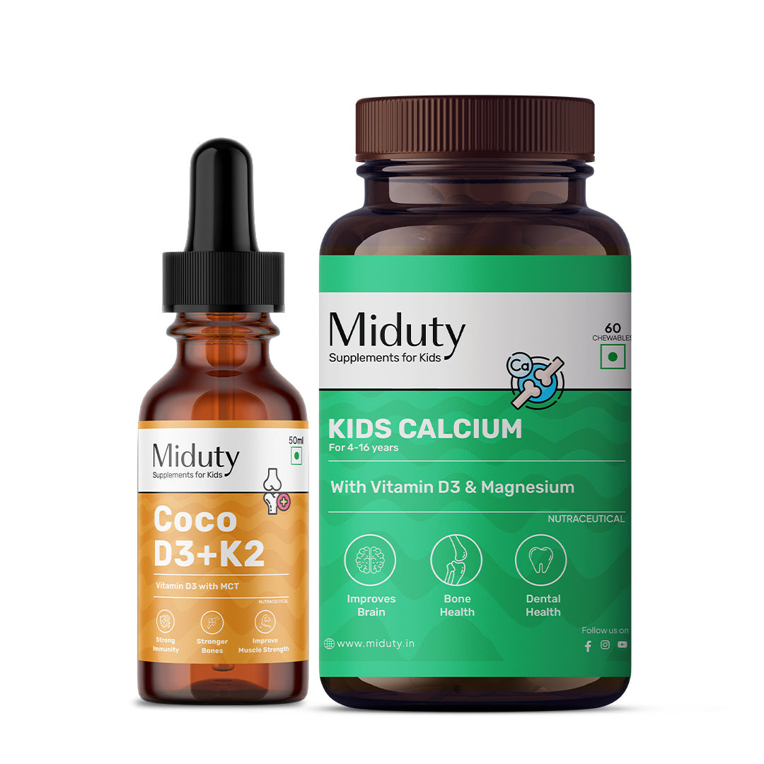 Ensure your child grows strong and healthy with Midutyโs Strong Bones Bundle, combining scientifically formulated Kids Calcium tablets with CoCo D3 + K2 drops. This duo works synergistically to support optimal bone growth, teeth development, and overall immunity in children.